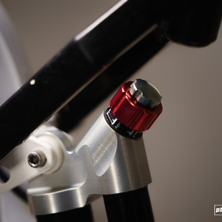En el tubo de dirección, Bossard con Sunn han optado por un tope de suspensión integrado, solo que decidió montarlo delante del tubo de dirección en lugar de en el cuadro. Lo que permite limitar el movimiento de giro de la horquilla y evitar que está se dañe con el cuadro.