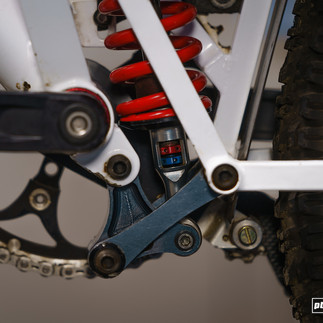 Es difícil obtener una imagen nítida del amortiguador, ya que está muy oculto dentro del cuadro. En el extremo inferior, se une a la bieleta mediante un rodamiento de ojal montado en un montante para que se mueva con mayor libertad bajo cargas direccionales. En la base hay un ajuste de rebote a alta y baja velocidad, un ajuste de compresión a alta y baja velocidad en la culata, además de una válvula de aire para ajustar la presión en el piggyback. Nico no está muy seguro de los ajustes exactos; cree que estaba alrededor del 40 % de sag, pero lo que sí es seguro es que, más de veinte años después, la moto aún hunde por su propio peso.